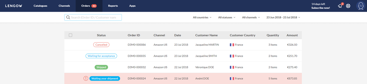 Um sicherzustellen, dass Sie keine Bestellungen mit Fehlern haben, überprüfen Sie regelmäßig den Abschnitt "Bestellungen" der Lengow-Plattform.