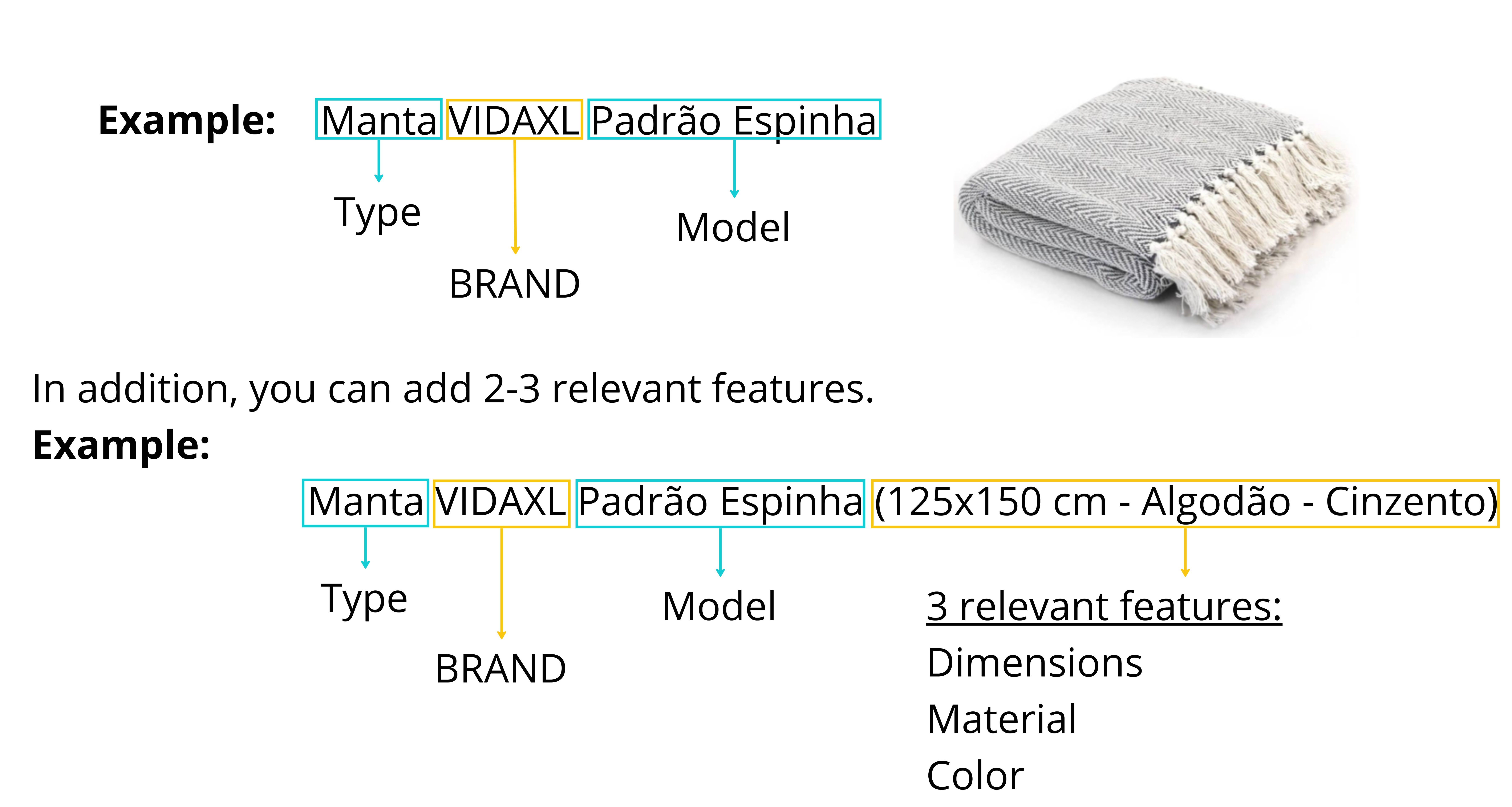 - Der Produktname muss kurz sein und muss identifizieren, was das Produkt ist.