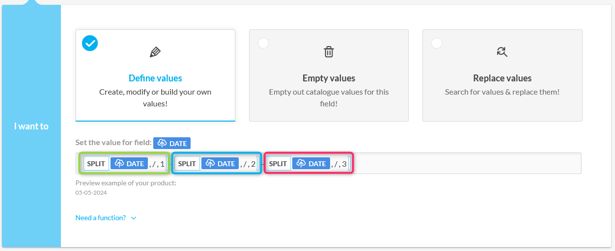 Nehmen wir das Beispiel eines DATE-Feldes in Ihrem Katalog, das wie folgt organisiert ist: 05/05/2024 (also DD/MM/YYYY).