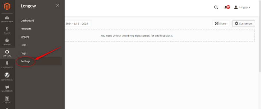 - Wählen Sie dann "Einstellungen" auf der Hauptseite unseres Lengow-Plugins.