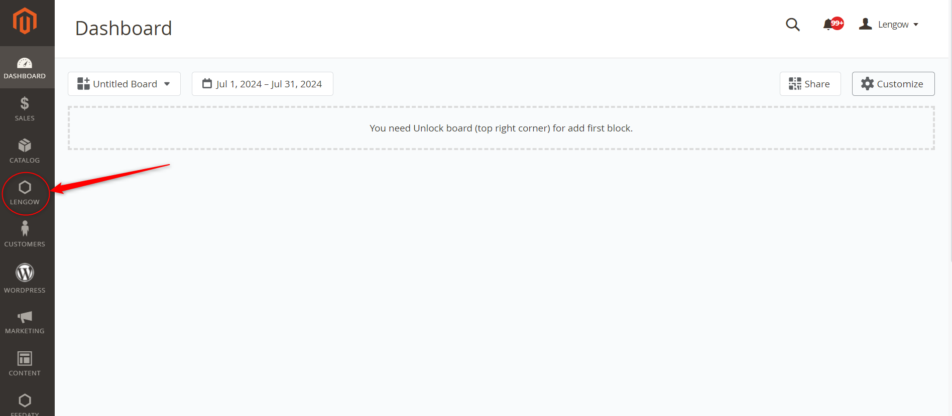 - Wenn Sie sich auf Ihrem Dashboard befinden, gehen Sie zum Lengow-Plugin und dann zu "Einstellungen".