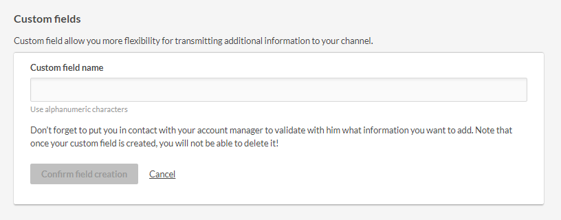 Einige Kanäle haben die Möglichkeit, benutzerdefinierte Felder hinzuzufügen, um personalisierte Attribute zu erstellen (Beispiel: Sensefuel, Kwanko).