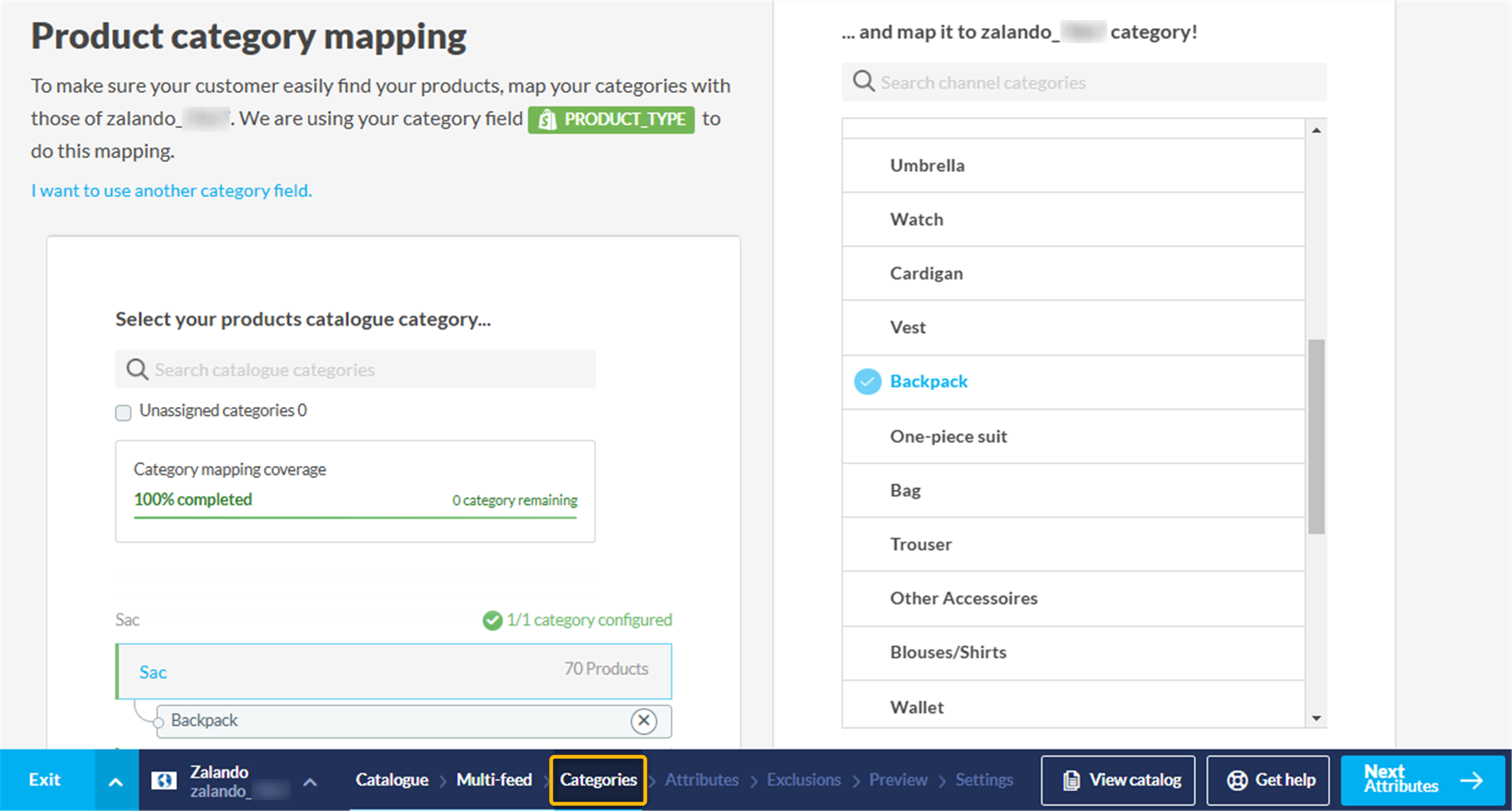 Ordnen Sie Ihre eigenen Kategorien den Zalando-Kategorien im Schritt Kategorien zu: