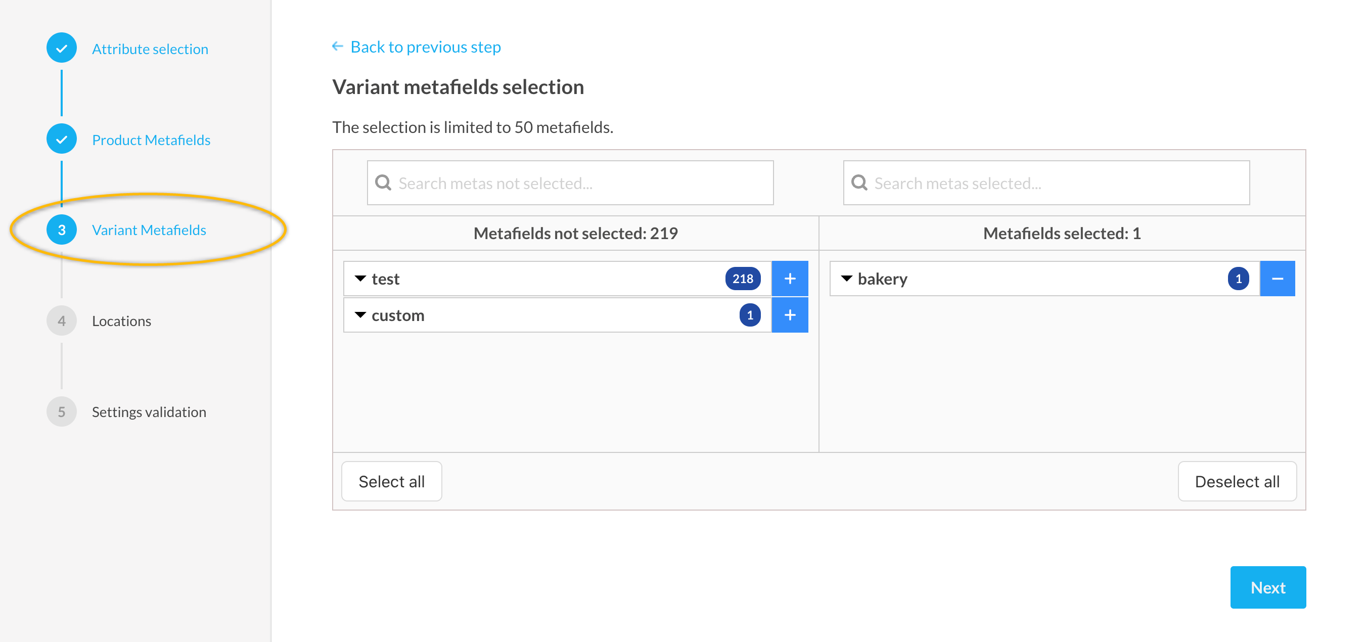 - Im Schritt "Produkt-Metafelder-Auswahl", wählen Sie die gewünschten Attribute aus oder ab, und klicken Sie dann auf "Weiter", um fortzufahren.