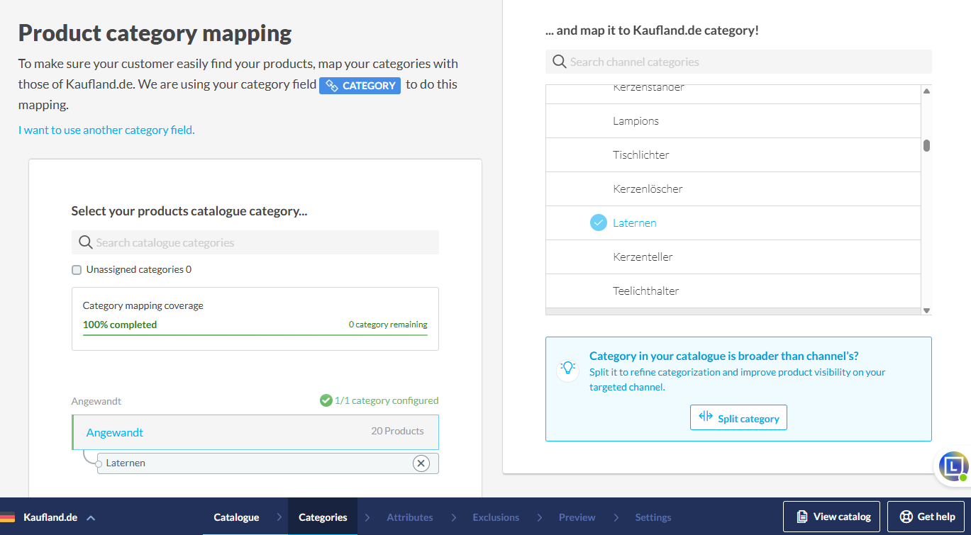 Applicable products: Netmarkets Kaufland - Kategorien Kartieren Sie Ihre eigenen Kategorien mit den Kategorien von Kaufland im Kategorien-Mapping Schritt. Aktualisiert 18. März 2025 15:47
