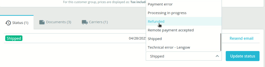 6. Aktualisieren Sie den Bestellstatus auf “Erstattet”