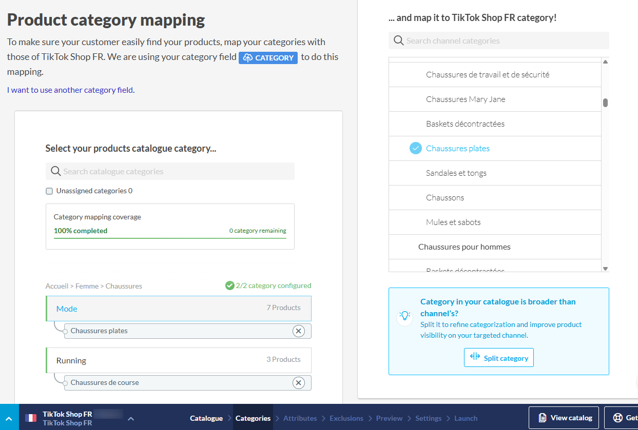Kartieren Sie Ihre eigenen Kategorien mit den Kategorien von TikTok Shop im Kategorien-Mapping Schritt.