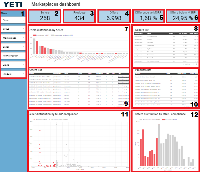 11. Verteilung der Verkäufer nach UVP-Konformität: Anzahl der Angebote in Punktgrafik vs Unterschied in % vs Ihr UVP. In Rot, Preise unter UVP, in Grau, über UVP.