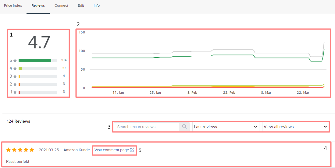 - Es gibt alle Bewertungen, die Ihre Verbraucher für das betreffende Produkt abgegeben haben, aufgelistet von neuesten bis ältesten.