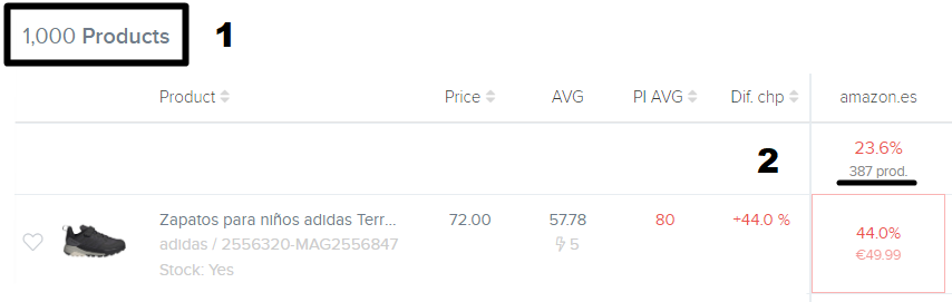 - Dif. chp oder Unterschied zum günstigsten: Drückt den Unterschied zwischen Ihrem Preis und dem günstigsten Preis aus, den bei den Konkurrenten gefunden wurde.