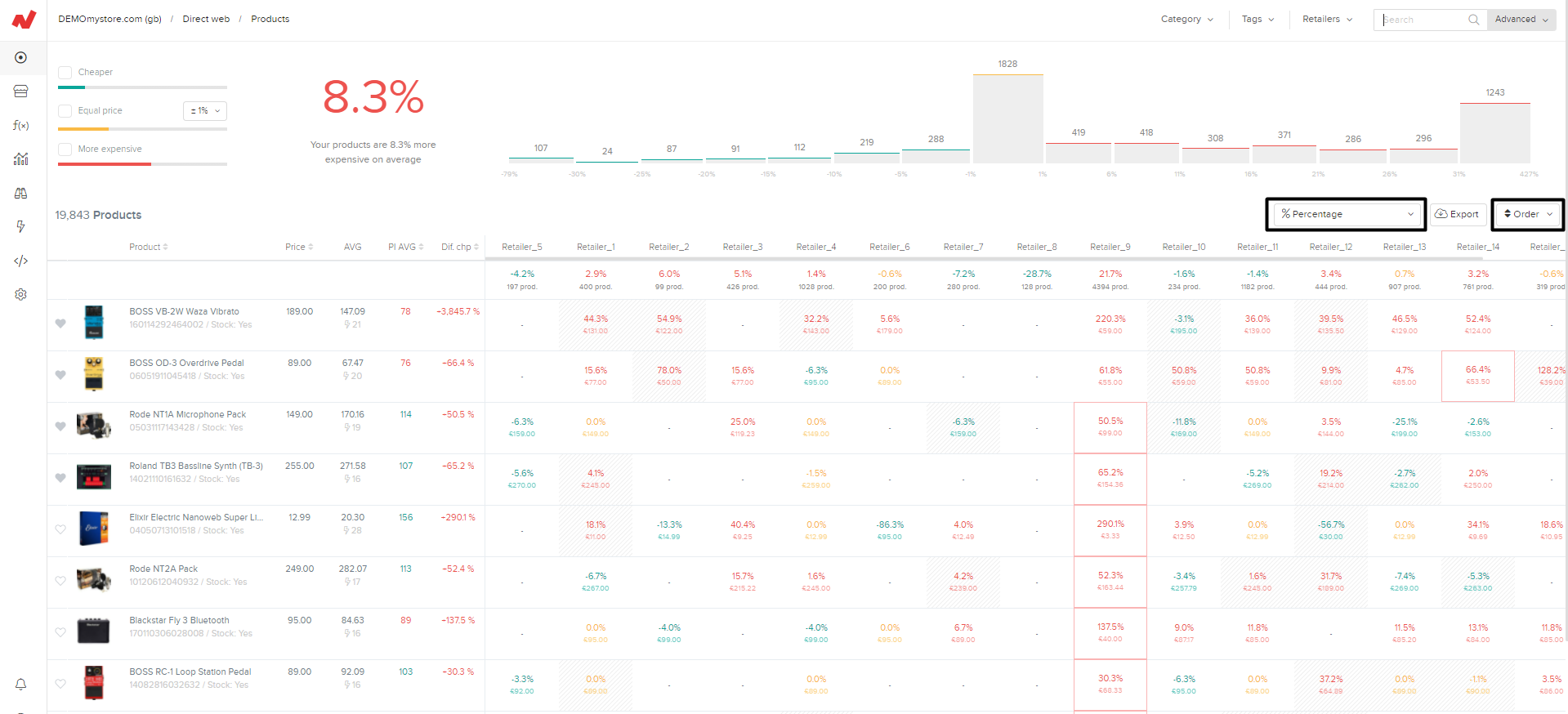 - Einzelhändler: Alle Einzelhändler und der Prozentsatz Ihres UVP/Preises im Vergleich zum Preis des Verkäufers/Konkurrenten in Frage.