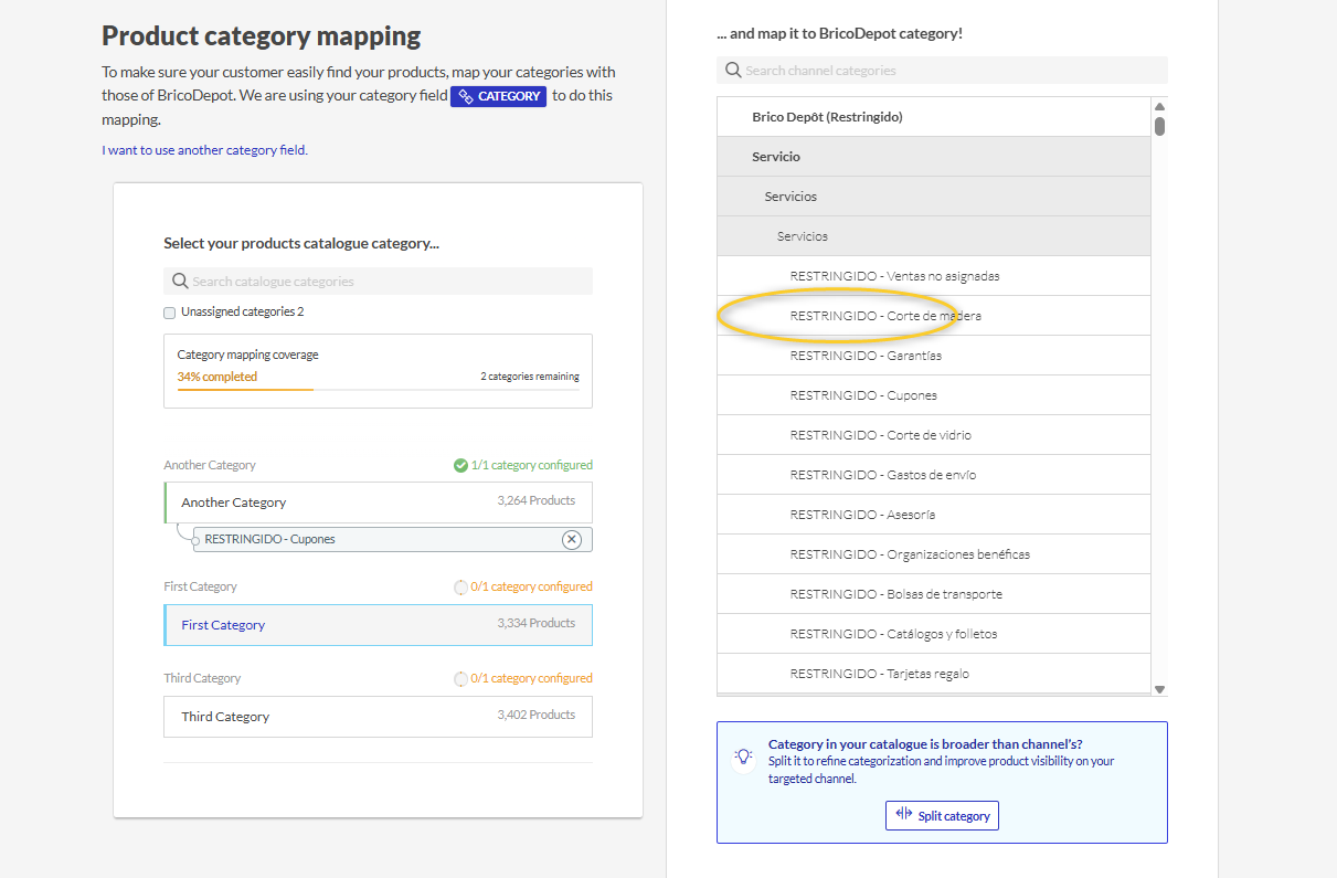 Kartieren Sie Ihre eigenen Kategorien mit den Kategorien von Brico Depôt auf dem Kategorien Schritt.