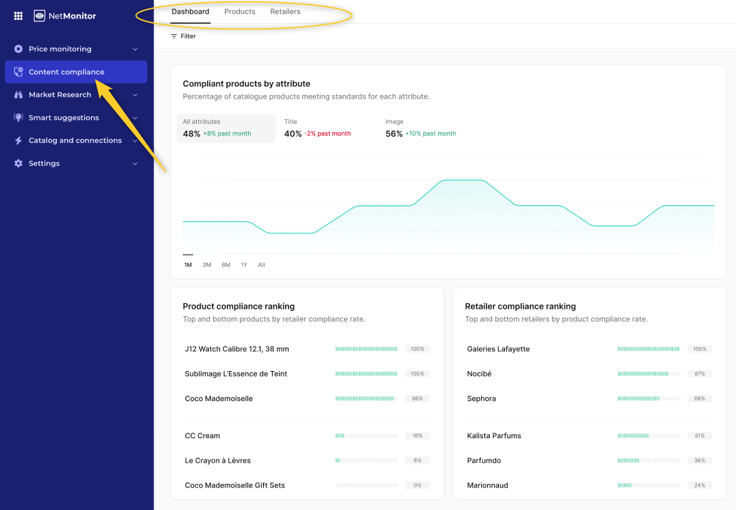 Der Content Compliance-Modul ist in drei Hauptbereiche unterteilt: Dashboard, Produkte und Einzelhändler.