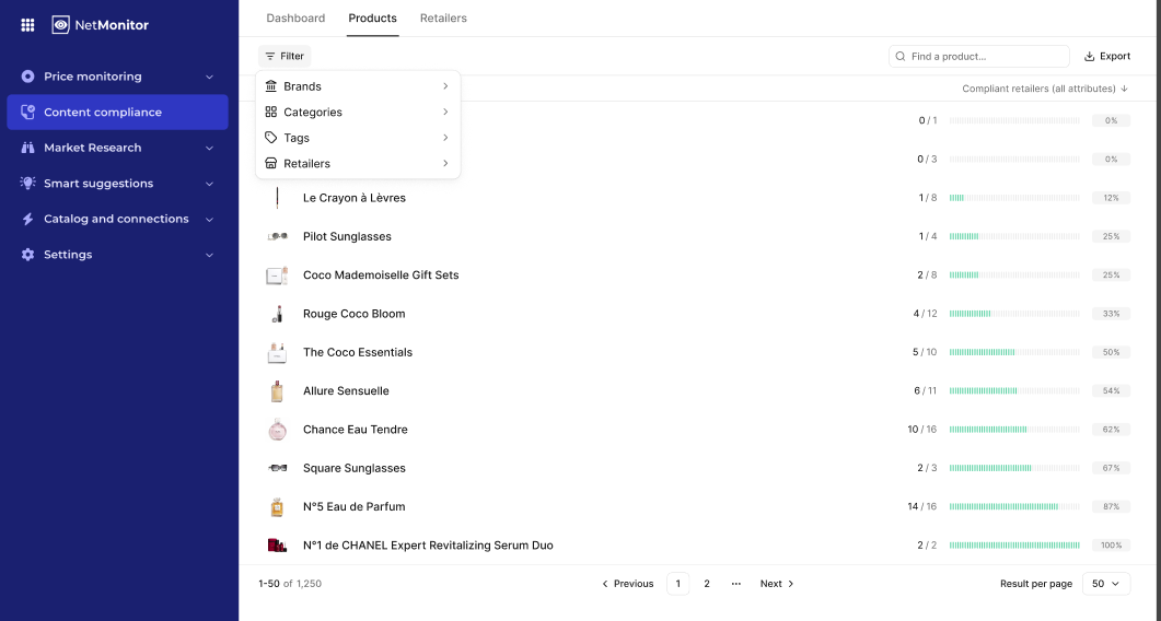 Sortierung: Organisieren Sie die Liste mit dem Dropdown-Menü "Konforme Einzelhändler (alle Attribute)", um Produkte mit den niedrigsten Konformitätsscores zu priorisieren.