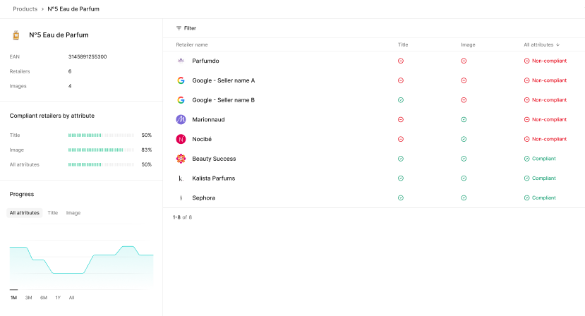 Konformitätsscore: Es handelt sich um das vorherige Verhältnis, das in % dargestellt wird. Daher ist es der % der Einzelhändler, die vollständig konform sind, über Titel und Bild für dieses spezifische Produkt