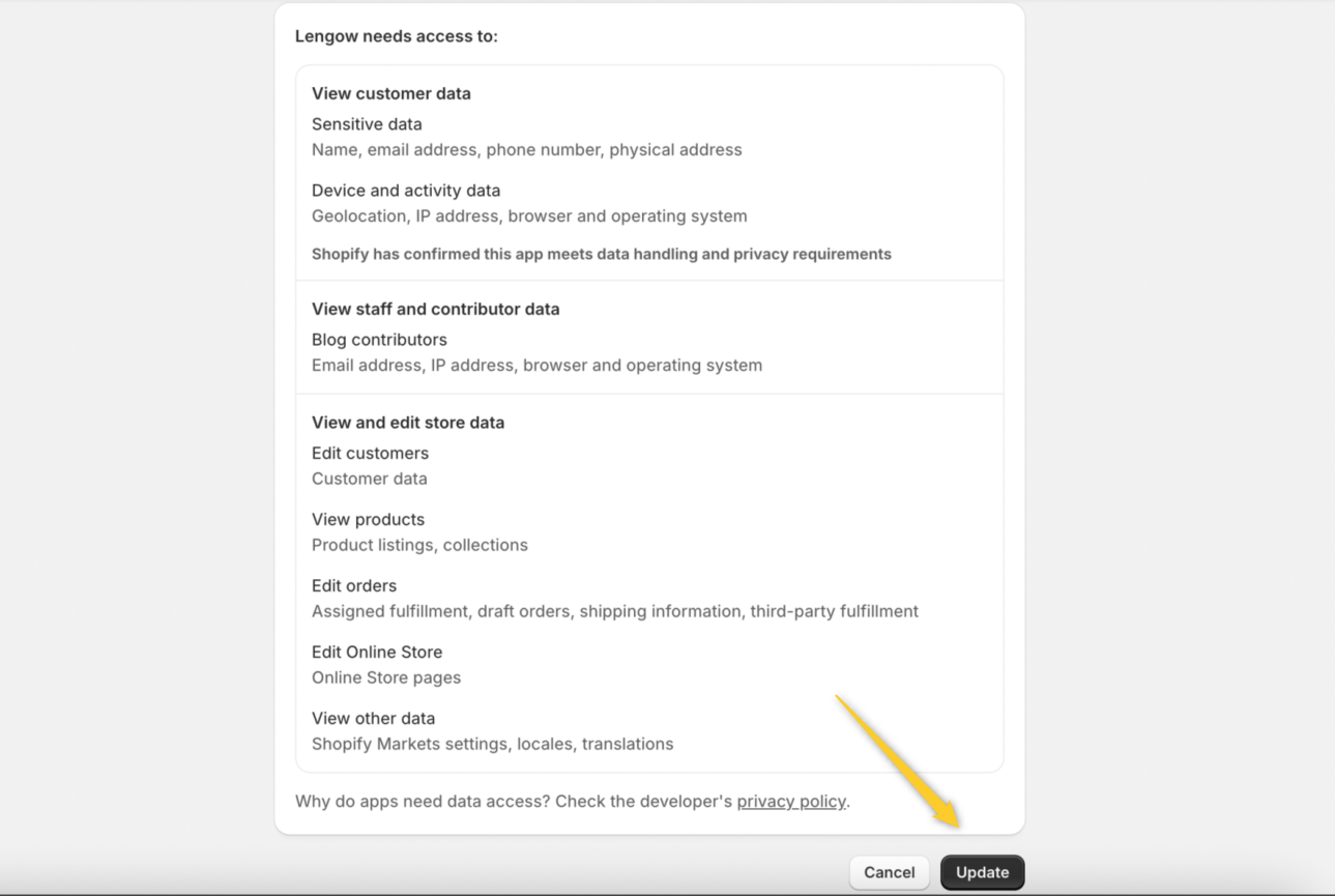 Um Shopify Markets zu unterstützen, benötigt Lengow Zugriff auf neue Datenkategorien in Ihrem Shop. Die Aktualisierung Ihrer App-Berechtigungen ermöglicht es Lengow, lokalisierte Informationen abzurufen, wie zum Beispiel: