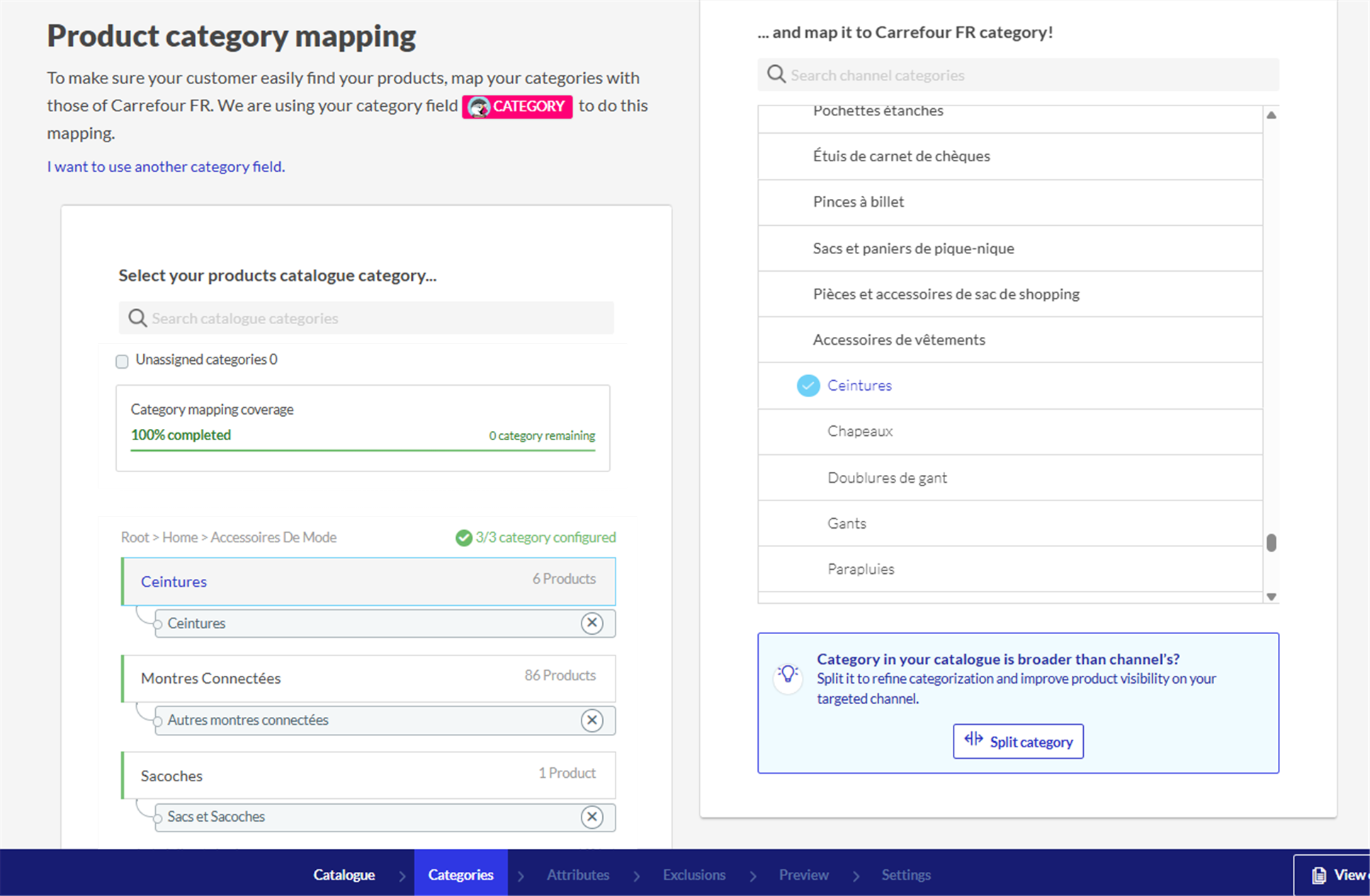 Applicable products: Netmarkets Carrefour (Mirakl) - Kategorien Kartieren Sie Ihre eigenen Kategorien mit den Kategorien von Carrefour im Kategorien-Mapping Schritt. Aktualisiert 13. November 2025 18:44