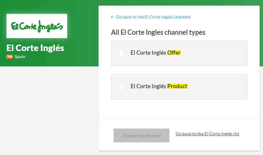Wenn Sie den Kanal "El Corte Inglés" in Ihrem Lengow-Konto hinzufügen, haben Sie die Wahl zwischen dem Angebot-Feed und dem Produkt-Feed: