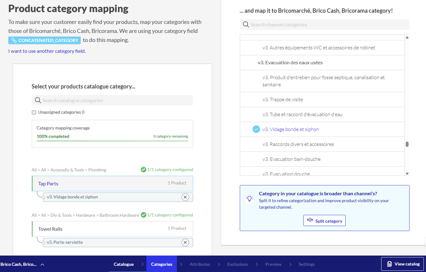 Applicable products: Netmarkets Bricomarché / Brico Cash / Bricorama (Mirakl) - Kategorien Kartieren Sie Ihre eigenen Kategorien mit den Kategorien des Kanals im Kategorien-Mapping Schritt. Aktualisiert 18. November 2025 11:45