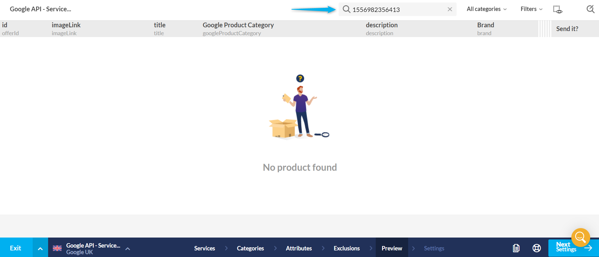If you are sure to have searched for the correct ID, but you are still not having any results, check if the product is not excluded from the feed.