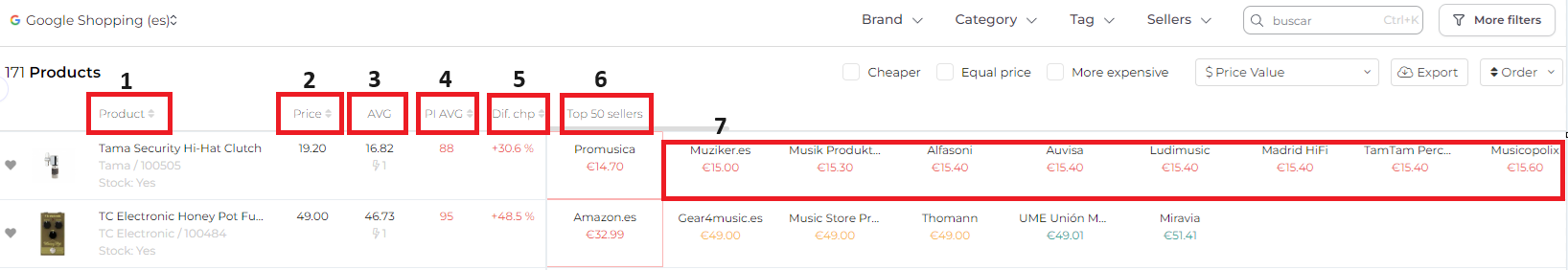 6. Top 50 sellers: Find the different sellers in the marketplace, as well as the price set for each of them. The color indicates: Green (your price/MSRP is cheaper than the seller), yellow (your price/MRSP is equal or similar), and red (your price/MSRP are more expensive). Positions are given according to the level of competitiveness of each one of the sellers.