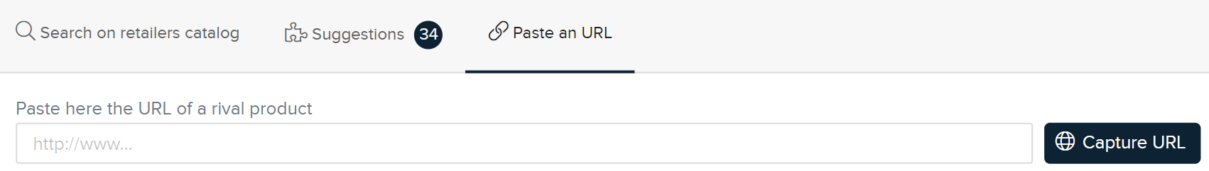 From the Connect tab you can get to connect more retailers to a specific product. There are three options available: Search on retailers catalog, Suggestions and Paste an URL.
