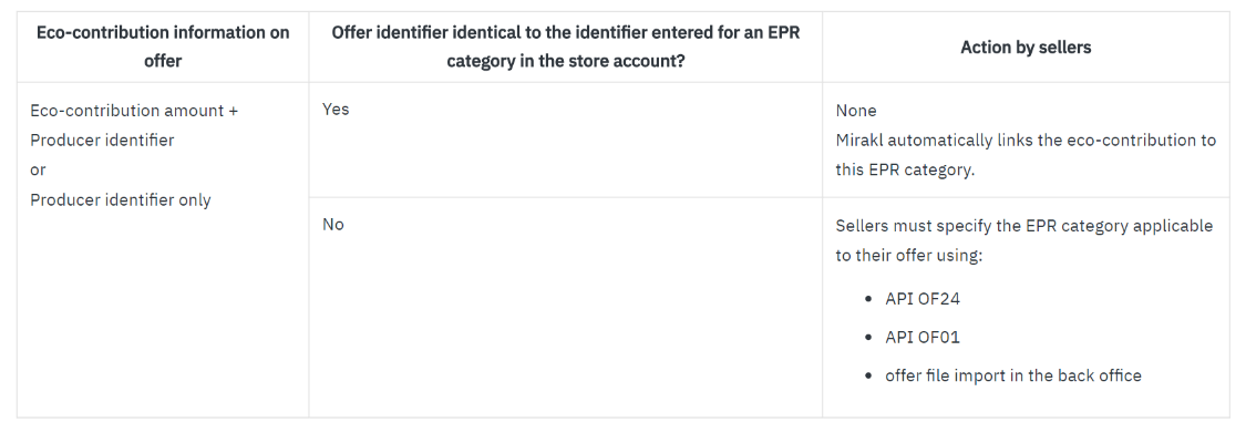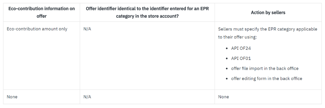 Sellers who have provided eco-contribution information on their offers must perform the actions described in the following table.