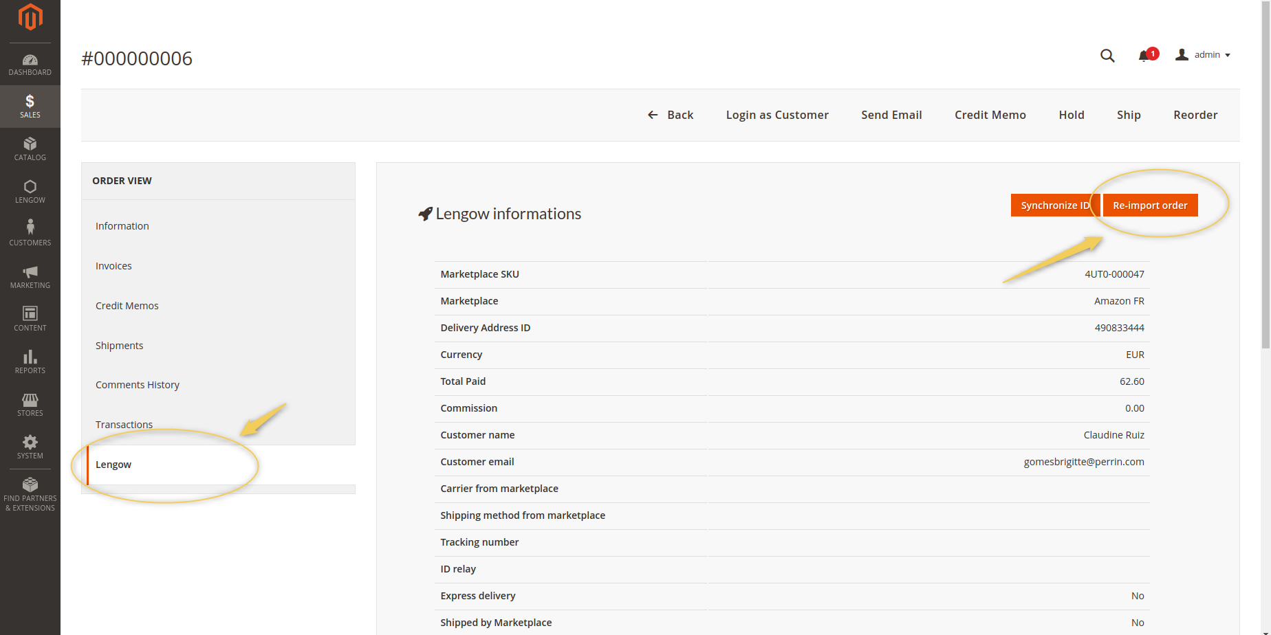 Si el pedido ha cambiado su estado a reembolsado o si los datos del pedido se han actualizado en Lengow, actualízalo en la página de pedidos de Magento que se ha importado. Ve a la sección de Lengow de la página y presiona reimportar pedido.