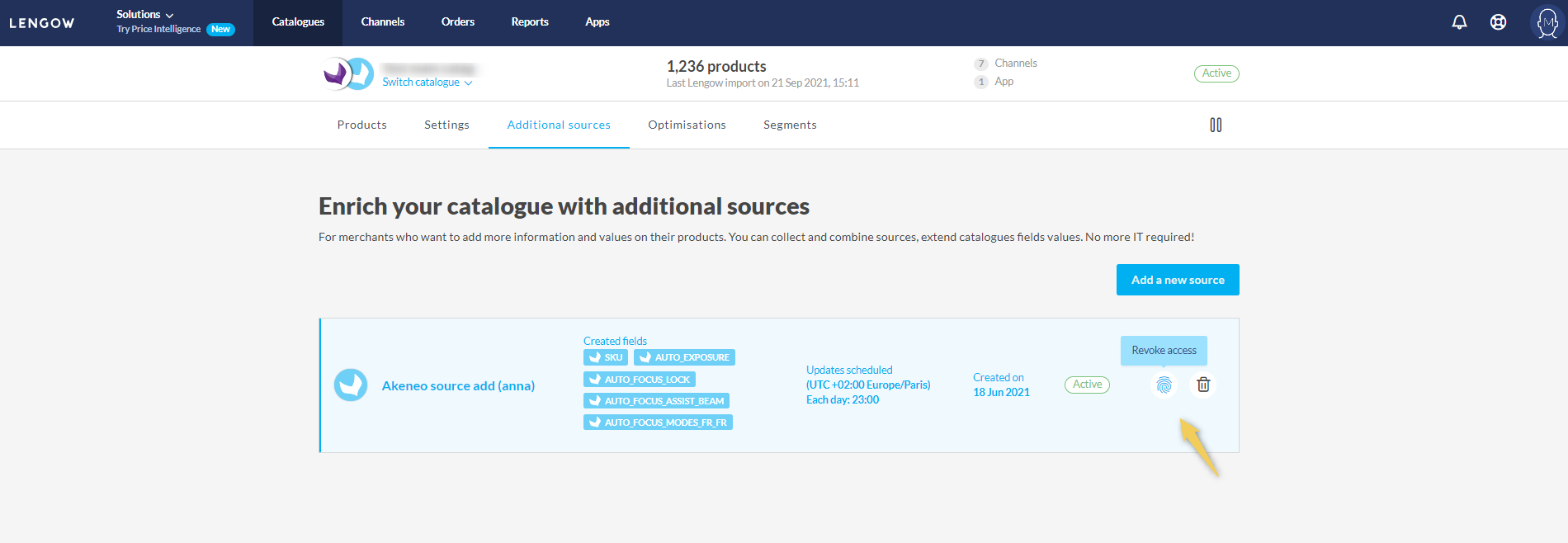 Puedes desactivar tu fuente adicional de Akeneo en cualquier momento haciendo clic en el "revoke access" botón: