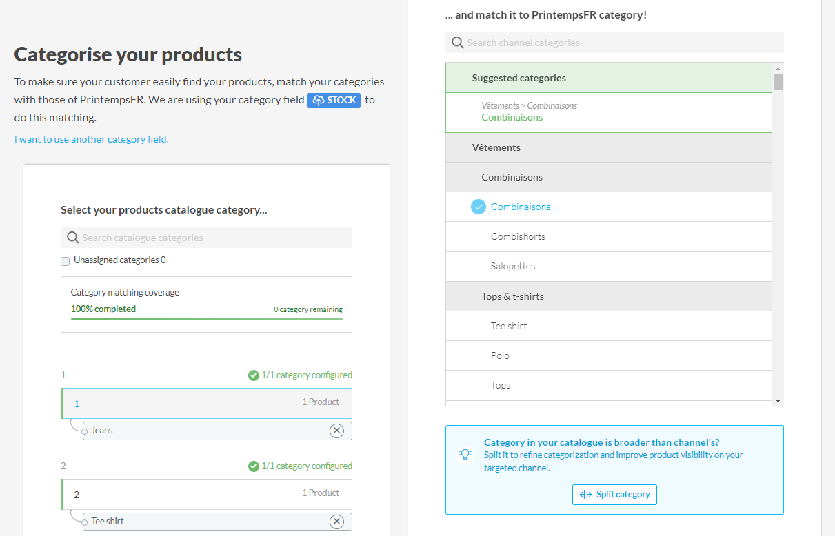 Applicable products: Netmarkets Printemps (Mirakl) - Categorías Empareja tus propias categorías con las categorías de Printemps en el Matching de Categorías paso. Actualización 22 de marzo de 2024 15:41