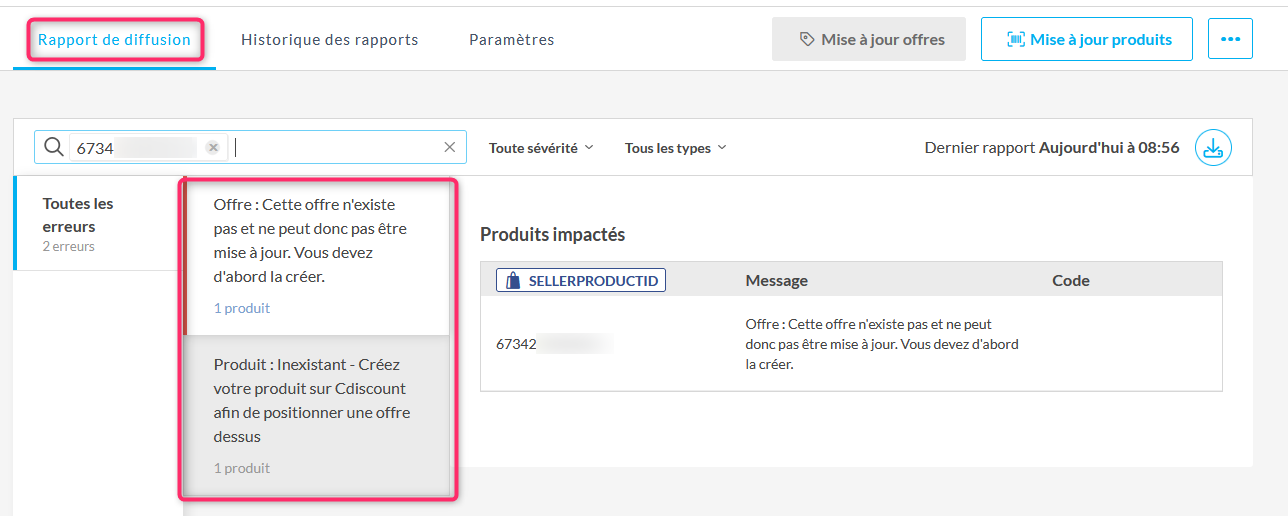 En este caso, mientras los errores de configuración no se corrijan, este error "Producto: Inexistente - Crea tu producto en Octopia para posicionar una oferta en él." seguirá siendo reportado en el informe de difusión de Lengow.