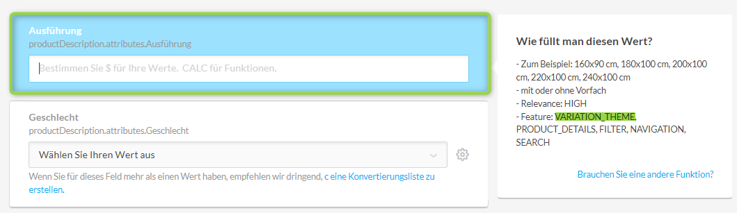 Ejemplo: Para el atributo "Zielgruppe", puedes seleccionar entre estos valores: Erwachsene; Jugendliche; Kinder