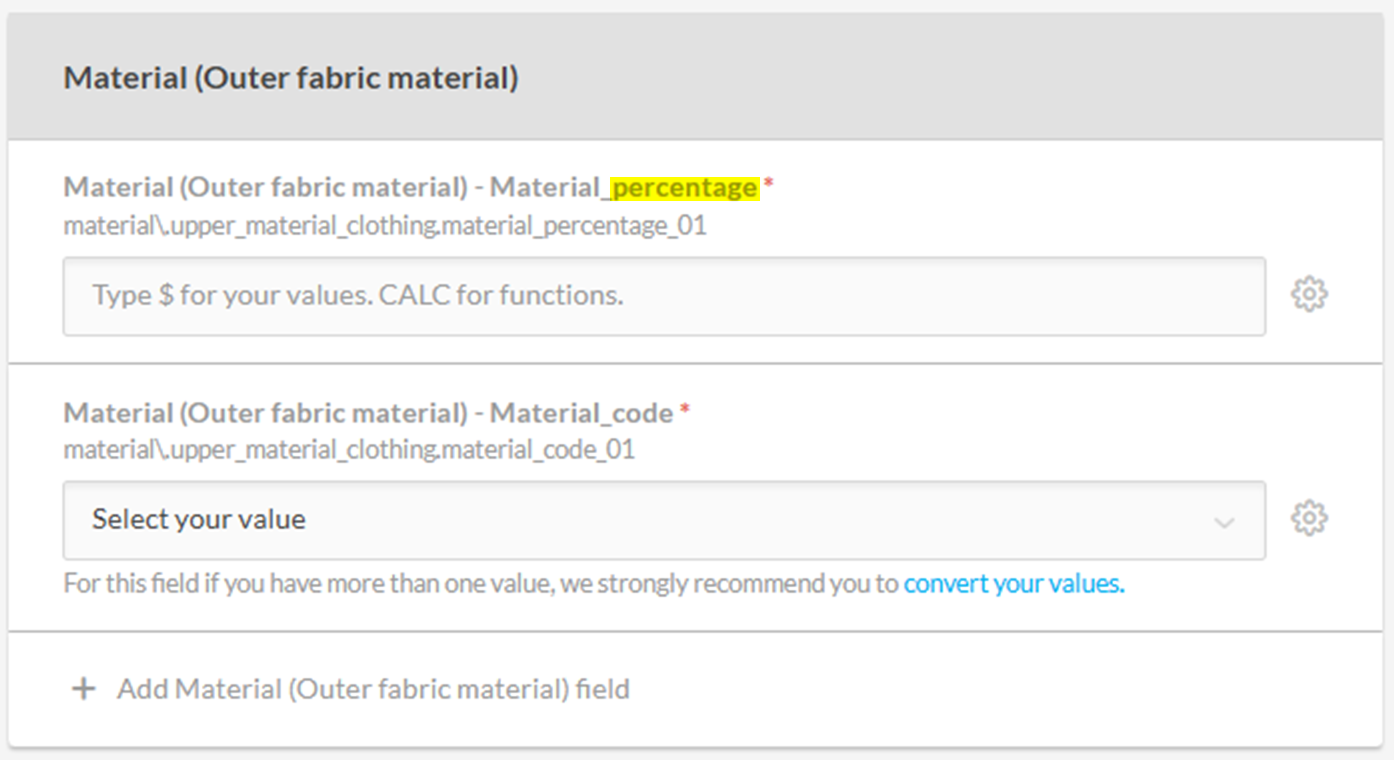 - Para ropa, rellena los diferentes materiales para cada parte del producto (forro, tela exterior, etc.). Puedes agregar un atributo para cada material con el porcentaje correspondiente (ver captura de pantalla a continuación).