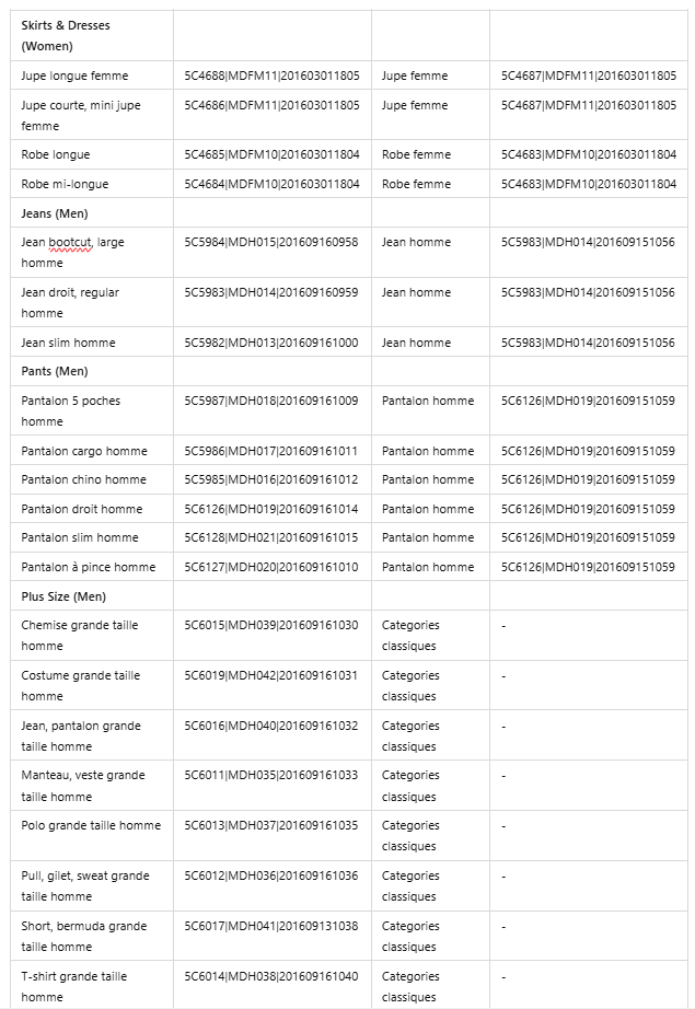 - Reemplazo de la categoría Moda (mujeres & hombres): Consulta en la lista a continuación los cambios en los nombres y la jerarquía de las categorías, y actualiza tus mapeos de productos en consecuencia.
