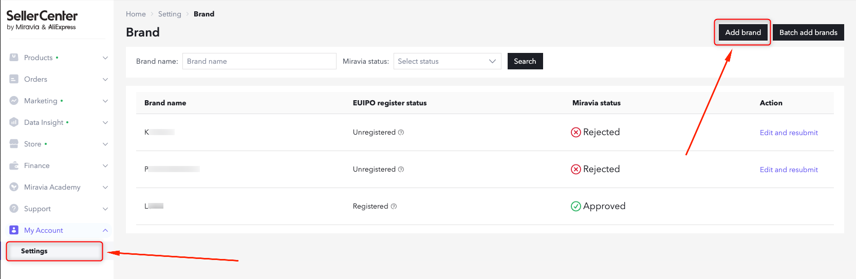 - En tu back-office de Miravia, ve a: "Cuenta" > "Configuración" > "Marcas"