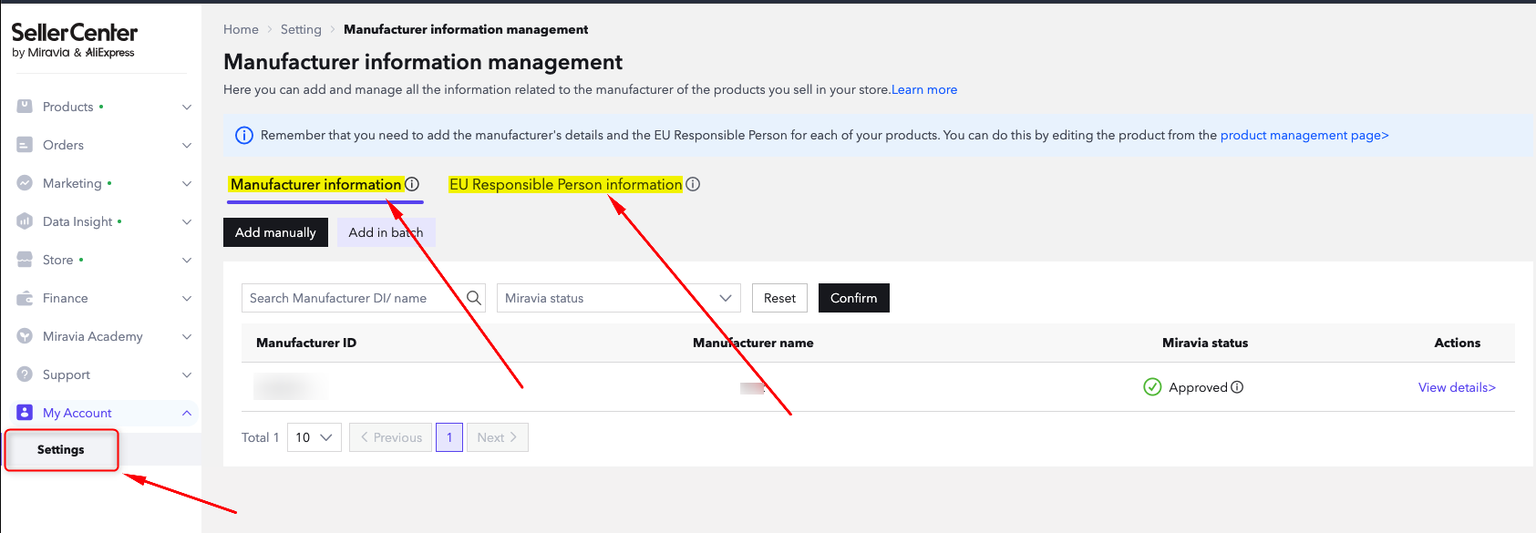 - En tu back-office de Miravia, ve a "Mi cuenta" > "Configuración" > "Información del fabricante"