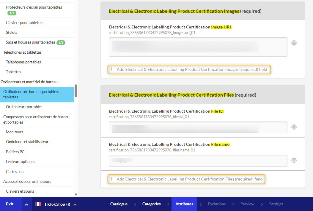 - Si es una imagen, introduce su URL en el atributo "Imagen de Certificación de Producto de Etiquetado Eléctrico y Electrónico URI -