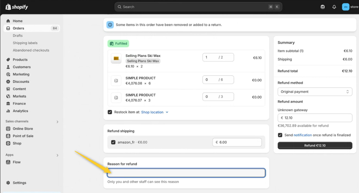 Puedes reembolsar o reembolsar parcialmente los pedidos directamente desde tu back office de Shopify. La información se enviará automáticamente al mercado.
