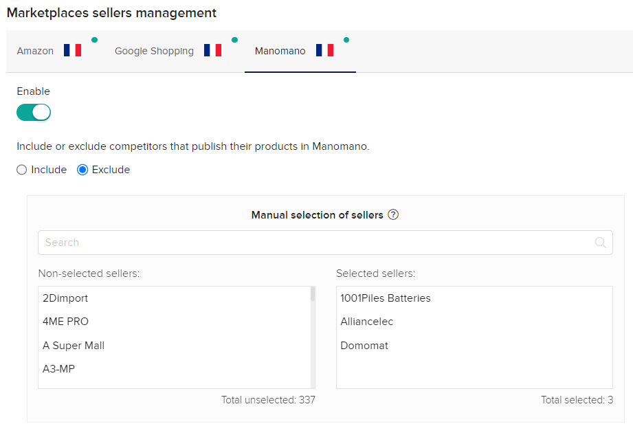 Si desactivas esta opción, los vendedores de marketplaces no se tendrán en cuenta, solo los Minoristas Web Directos, es decir, que solo recibirássugerencias basadas en el precio del ganador de la buybox/precio principal mostrado en el mercado para los productos conectados.