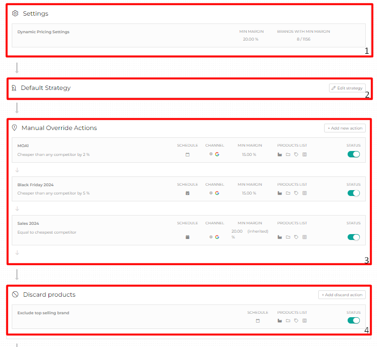 - Descartar vendedores por debajo del margen mínimo: El margen mínimo se establece en la etapa de configuración en el editor de estrategia. Cualquier vendedor por debajo de él es descartado del cálculo y no se considera en la fijación de precios dinámica.
