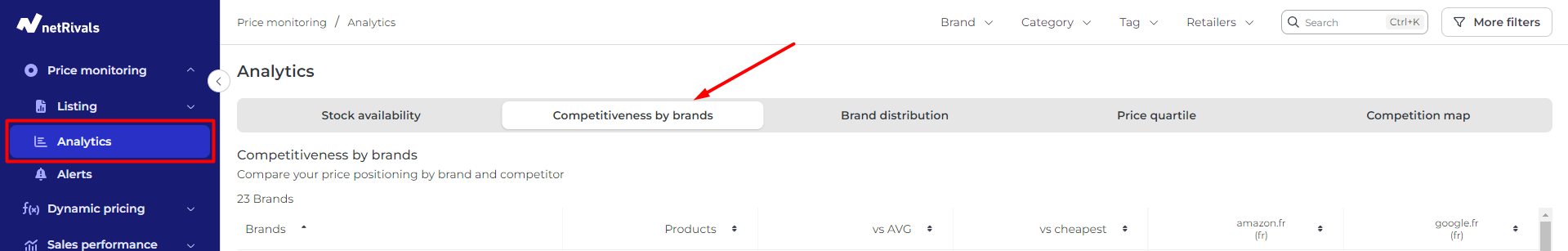 Este módulo es accesible desde Monitoreo de precios > Analíticas > Competitividad por marcas