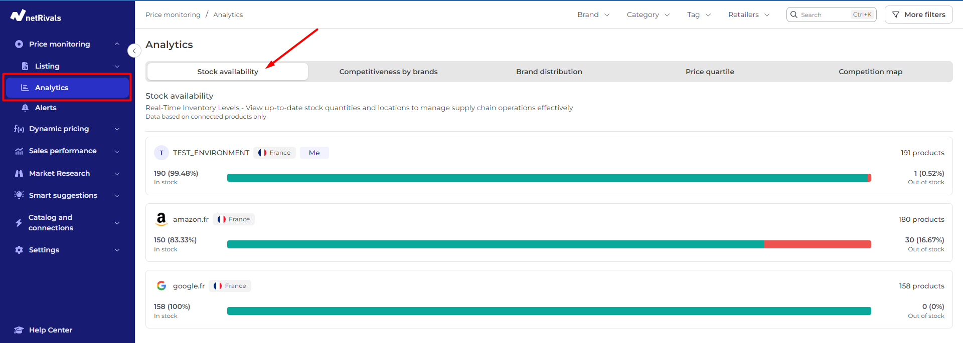 Este módulo es accesible desde Monitoreo de precios > Analítica> Disponibilidad de stock