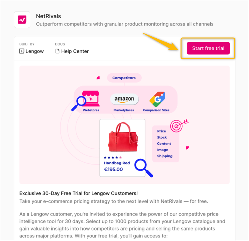 Lengow ofrece una prueba gratuita de 30 días de NetRivals y NetMonitor para los usuarios existentes de NetMarkets o NetAmplify, directamente dentro de la plataforma Lengow.