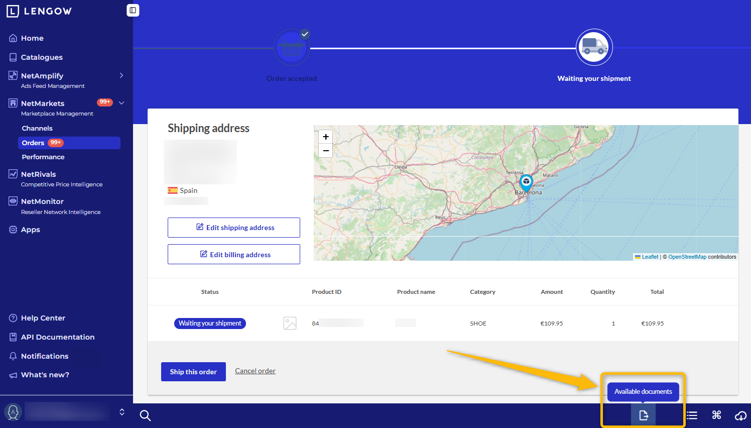En el estado "waiting_shipment", la etiqueta de envío del pedido está disponible en Lengow en la página de detalles del pedido (ver captura de pantalla a continuación) así como a través de la API de Pedidos de Lengow.