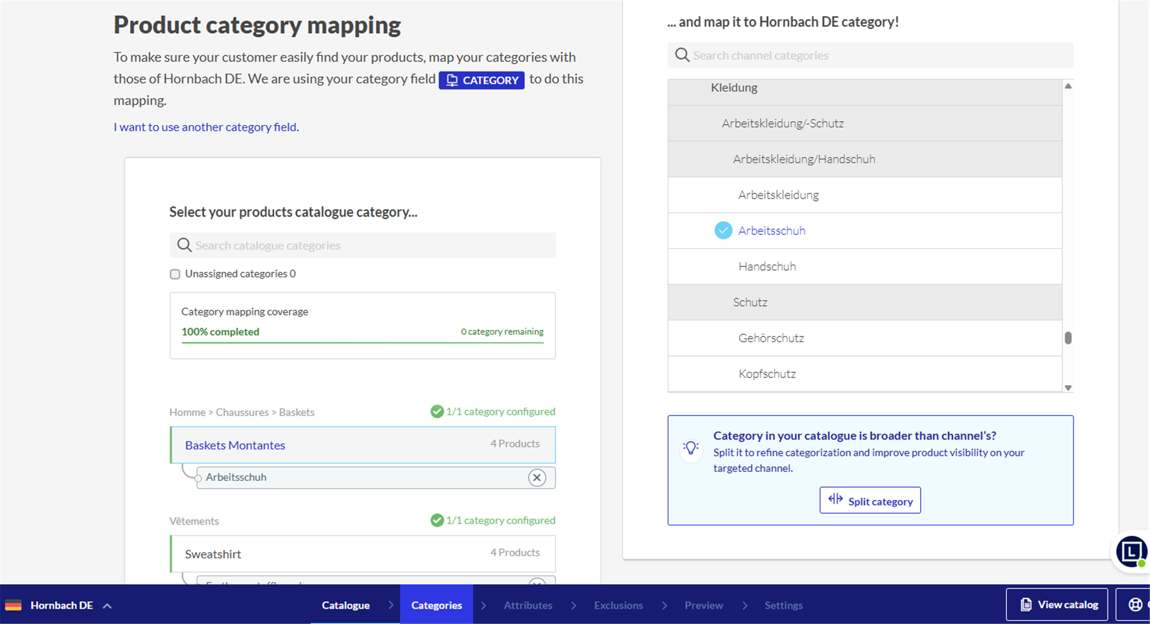 Mapea tus propias categorías con las categorías de HORNBACH (en alemán) en el paso de Mapeo de categorías.