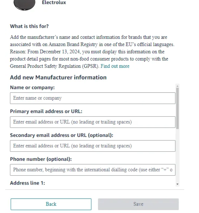 Este error aparece cuando la información requerida sobre las Regulaciones Generales de Seguridad de Productos (GPSR) falta o es incorrecta.