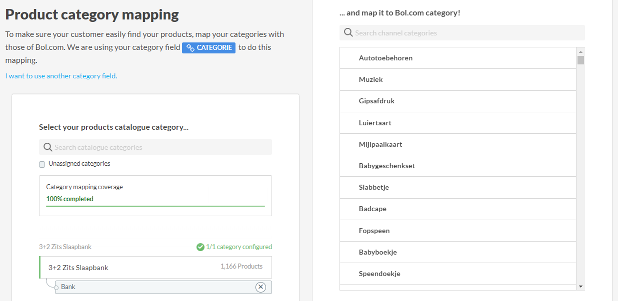 Mapea tus propias categorías con las categorías de bol.com en el Categorías paso.