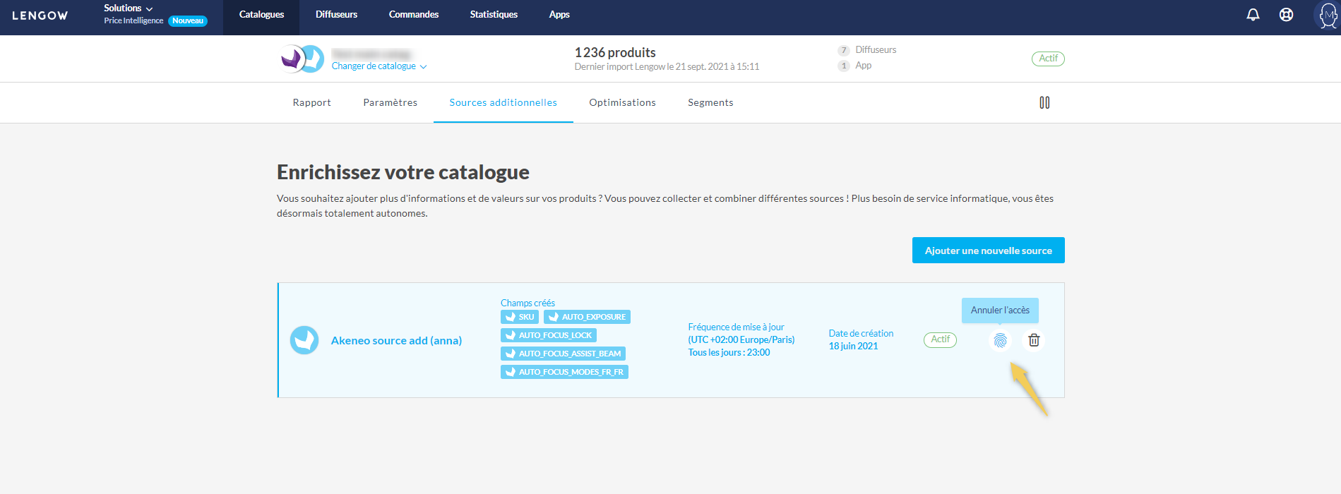 Vous pouvez Ă tout moment dĂ©sactiver votre source additionnelle Akeneo en cliquant sur le bouton "annuler l'accès".Â