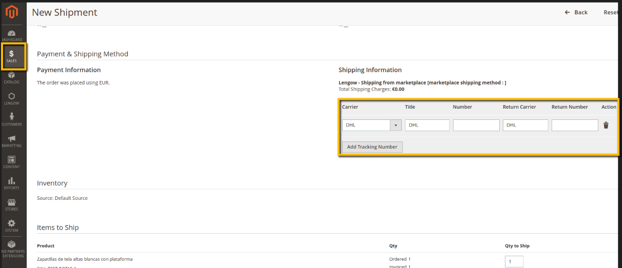 Dans la dernière version du plugin Lengow pour Magento 2, des champs sont mis à disposition pour fournir le numéro de suivi de retour et/ou le transporteur de retour lors de l'expédition d'une commande, si la marketplace le demande.