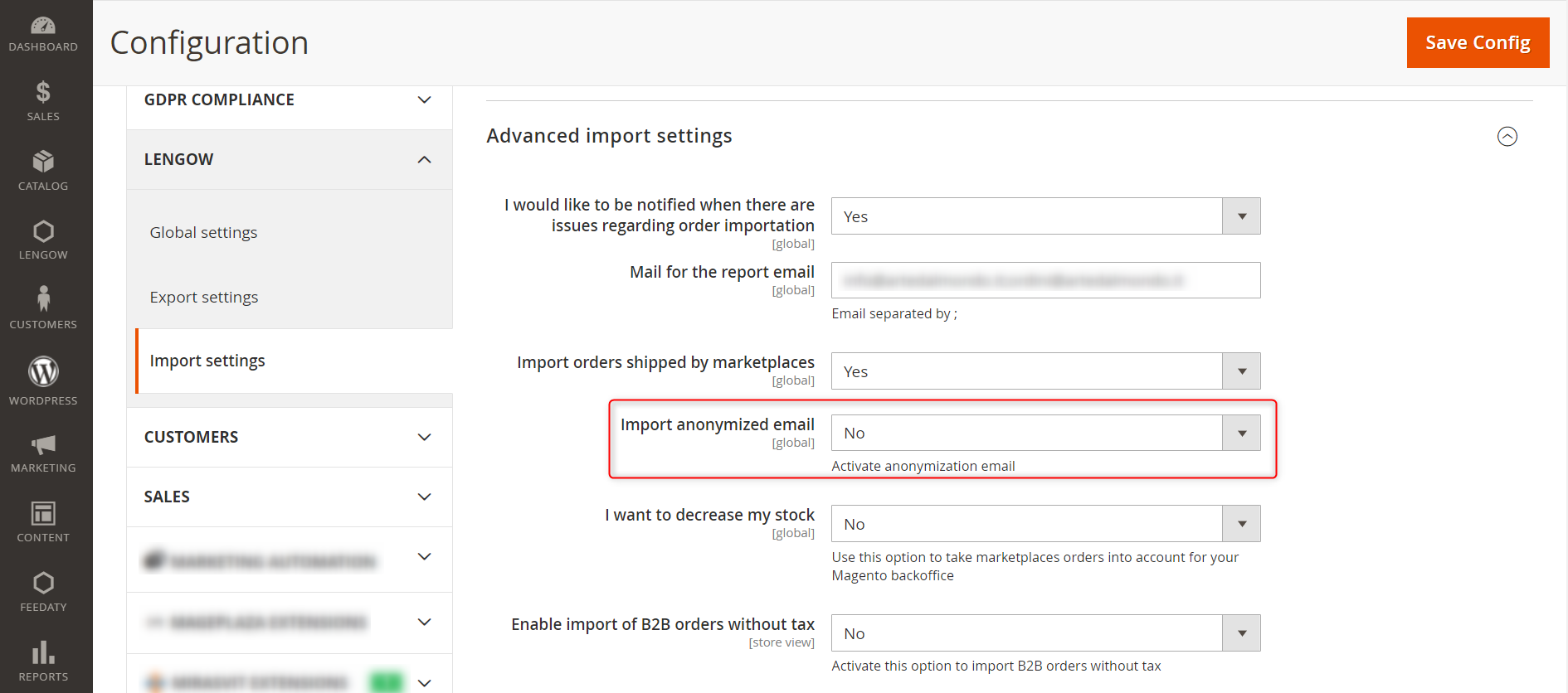 - Sur cette page, vous trouverez le paramètre d'anonymisation des adresses e-mail des clients, que vous devez activer.
